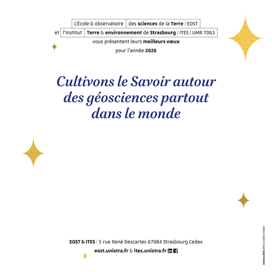 L’École et Observatoire des Sciences de la Terre, l'Institut Terre et environnement de Strasbourg, nos Instituts thématiques interdisciplinaires GeoT et Switch, nos Observatoires, nos Musées, vous présentent leurs Meilleurs Voeux pour la nouvelle année 2026.