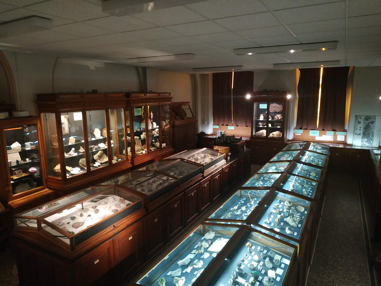 Salle de classification des minérauxAmazonite, Colorado, USASalle de minéralogie RhénaneAzurite, Lyon, FranceAzurite, Kamsdorf, AllemagneVitrine des modèles cristallographiques en fil de ferGoniomètre de Wollaston, restauréStibine, Toscane, ItalieWulfénite, Maroc