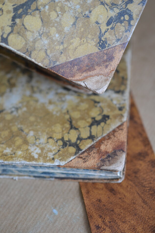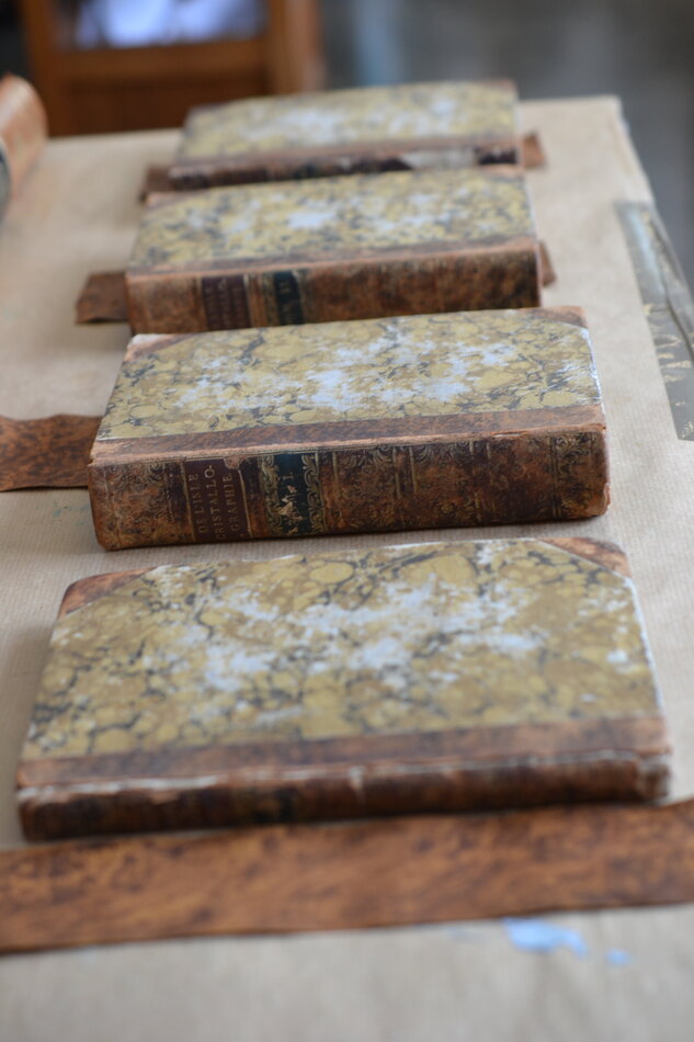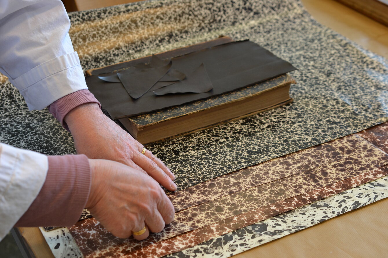 Les choix des papiers, tissus et cuirs sont l'objet d'une réflexion approfondie, prenant en compte la nature de l'ouvrage et sa spécificité, son historicité, des critères estéthiques, mais également en adéquation avec les normes de bonne conservation d'ouvrages anciens, de nature patrimoniale.